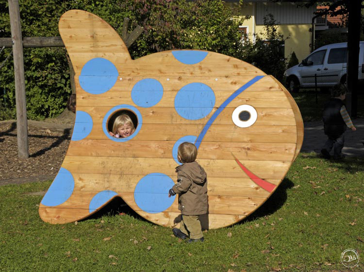 The Small Fish with the peepholes is a playing house which lends a special character to the playground. Its appearance and attractive decorative paintwork make it a popular attraction point for small children. The roof surface, which is open on both sides, has appealing peepholes set into it. The inside space is a meeting point as well as an area for play activities. Children can hide inside the tummy of the fish, keep a lookout or make themselves comfortable, just as if they were in a little house.Recommended For